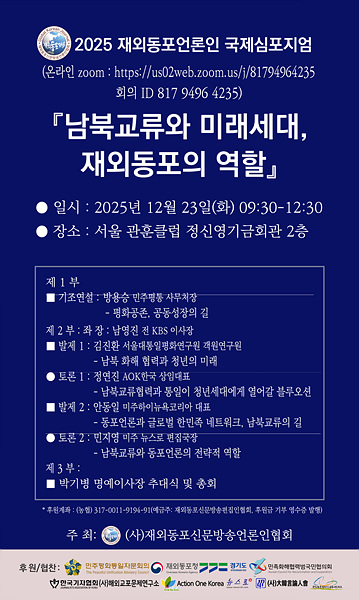 <³²ºÏ±³·ù¿Í ¹Ì·¡¼¼´ë, Àç¿Üµ¿Æ÷ÀÇ ¿ªÇÒ>À» ÁÖÁ¦·Î ÇÑ À̹ø ±¹Á¦½ÉÆ÷Áö¾öÀº Àç¿Üµ¿Æ÷û°ú ¹ÎÁÖÆòÈÅëÀÏÀÚ¹®È¸ÀÇ(¹ÎÁÖÆòÅë), ¹ÎÁ·ÈÇØÇù·Â¹ü±¹¹ÎÇùÀÇȸ(¹ÎÈÇù), °æ±âµµ, Çѱ¹±âÀÚÇùȸ, ´ëÇѾð·ÐÀÎȸ µî ÁÖ¿ä ±â°üµéÀÌ ÈÄ¿ø»ç·Î Âü¿©Çß´Ù. À̹ø ½ÉÆ÷Áö¾ö¿¡¼´Â ¾ó¾îºÙÀº ³²ºÏ°ü°èÀÇ µ¹ÆÄ±¸¸¦ ¸¶·ÃÇϱâ À§ÇØ Àç¿Üµ¿Æ÷µéÀÇ ¿ªÇÒÀ» ¸ð»öÇÏ´Â ½Ã°£ÀÌ µÉ °ÍÀ¸·Î ±â´ëÇϰí ÀÖ´Ù.